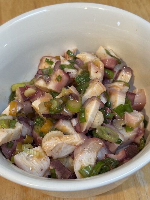 Yalaka’ todu i lemon, i asiga, i setboyas, i denne’ yan i gåmson – Mix the lemon, salt, green onions, hot peppers and octopus.